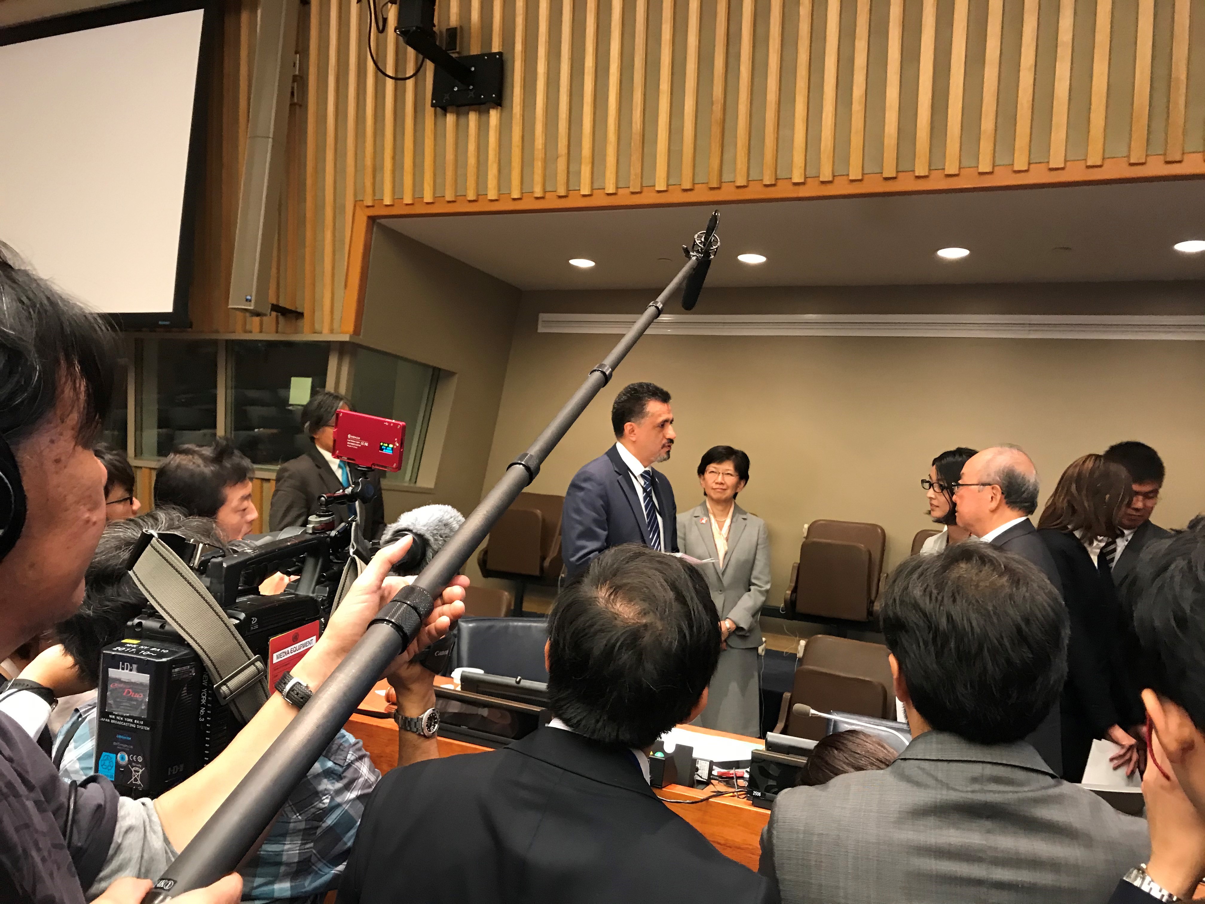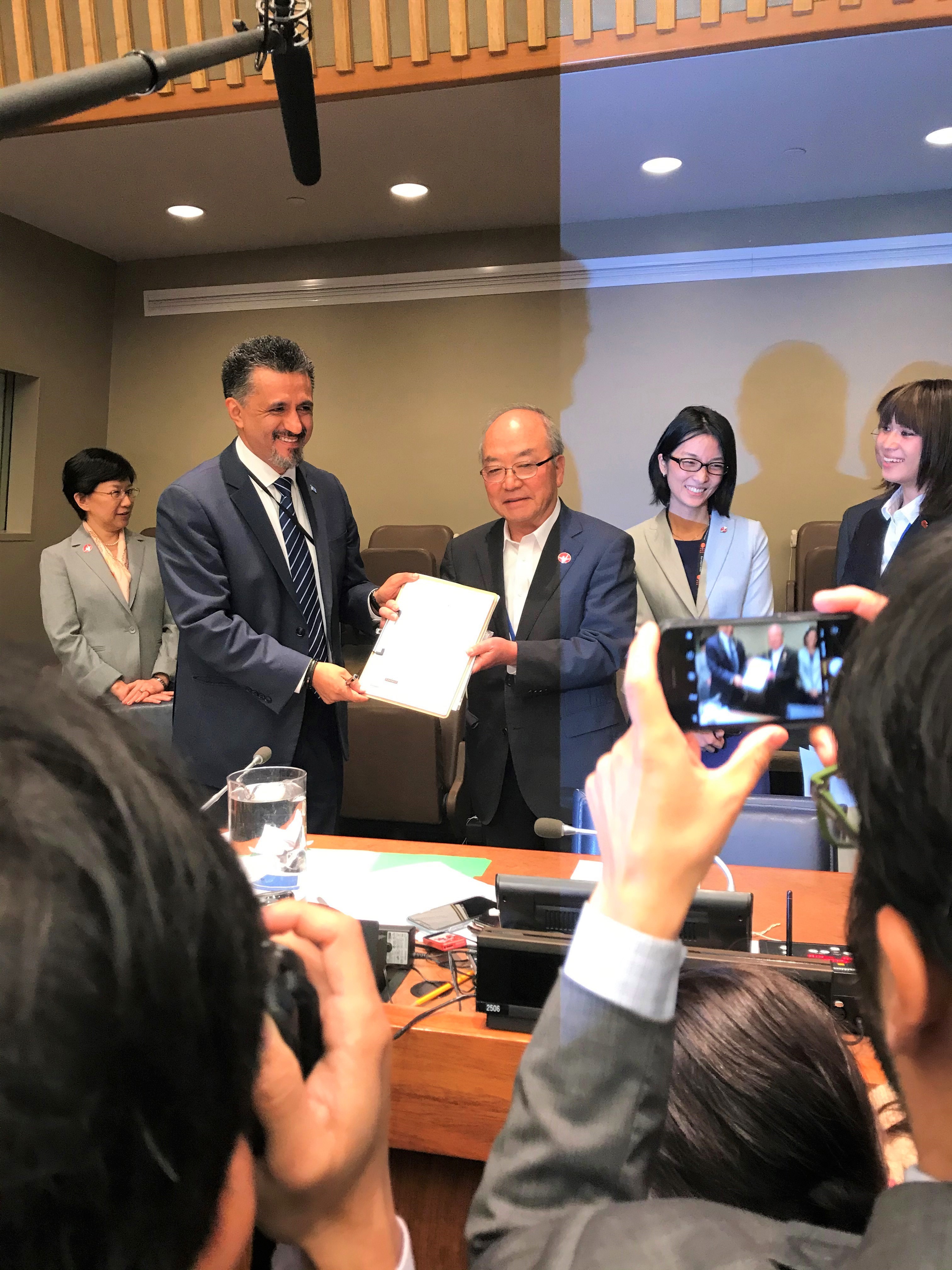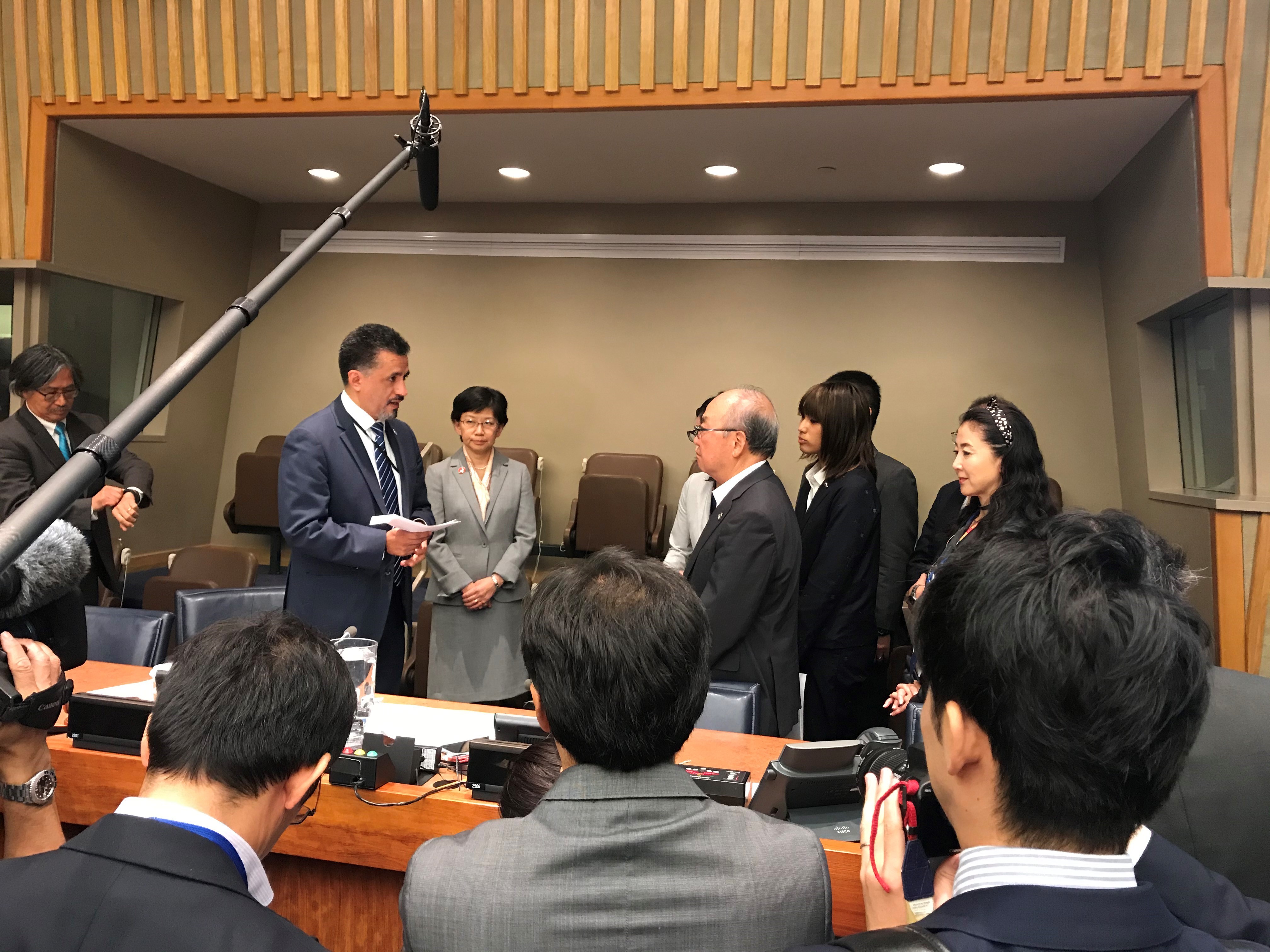 On 11 October, H.E. Mr. Sacha Llorenti, President of the First Committee of the 74th Session of the United Nations General Assembly, and Ms. Izumi Nakamitsu, Under-Secretary-General and High Representative for Disarmament Affairs, met with Mr. Toshiki Fujimori, Assistant Secretary General of Nihon Hidankyo (Japan Confederation of A-and H-Bomb Sufferers Organizations), to receive the “Appeal of the Hibakusha”, a symbolic representation containing 10,517,872 signatures calling for the elimination of nuclear weapons. Nihon Hidankyo is the only nationwide Japanese independent organization of hibakusha (atomic bomb survivors) of Hiroshima and Nagasaki.