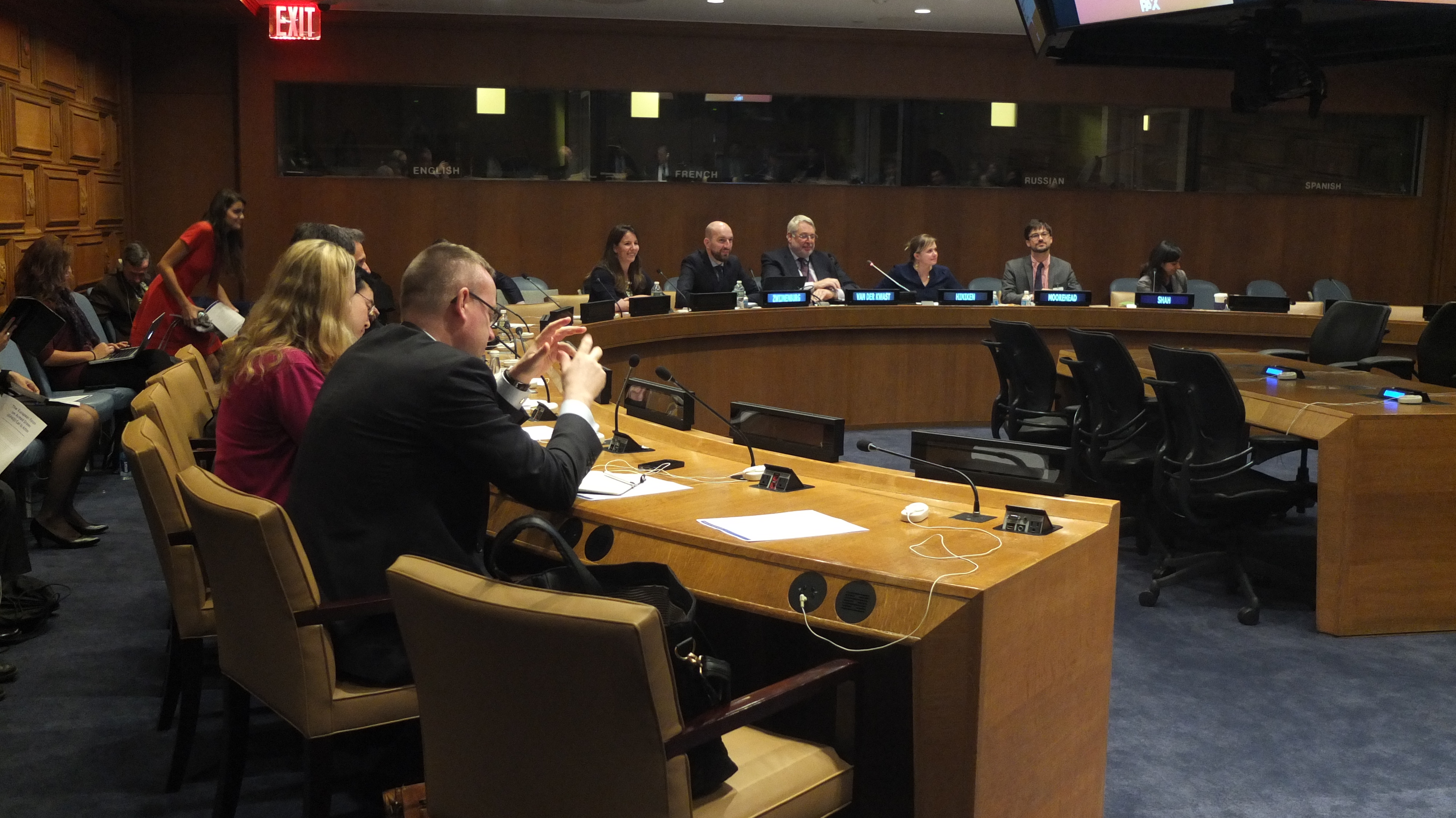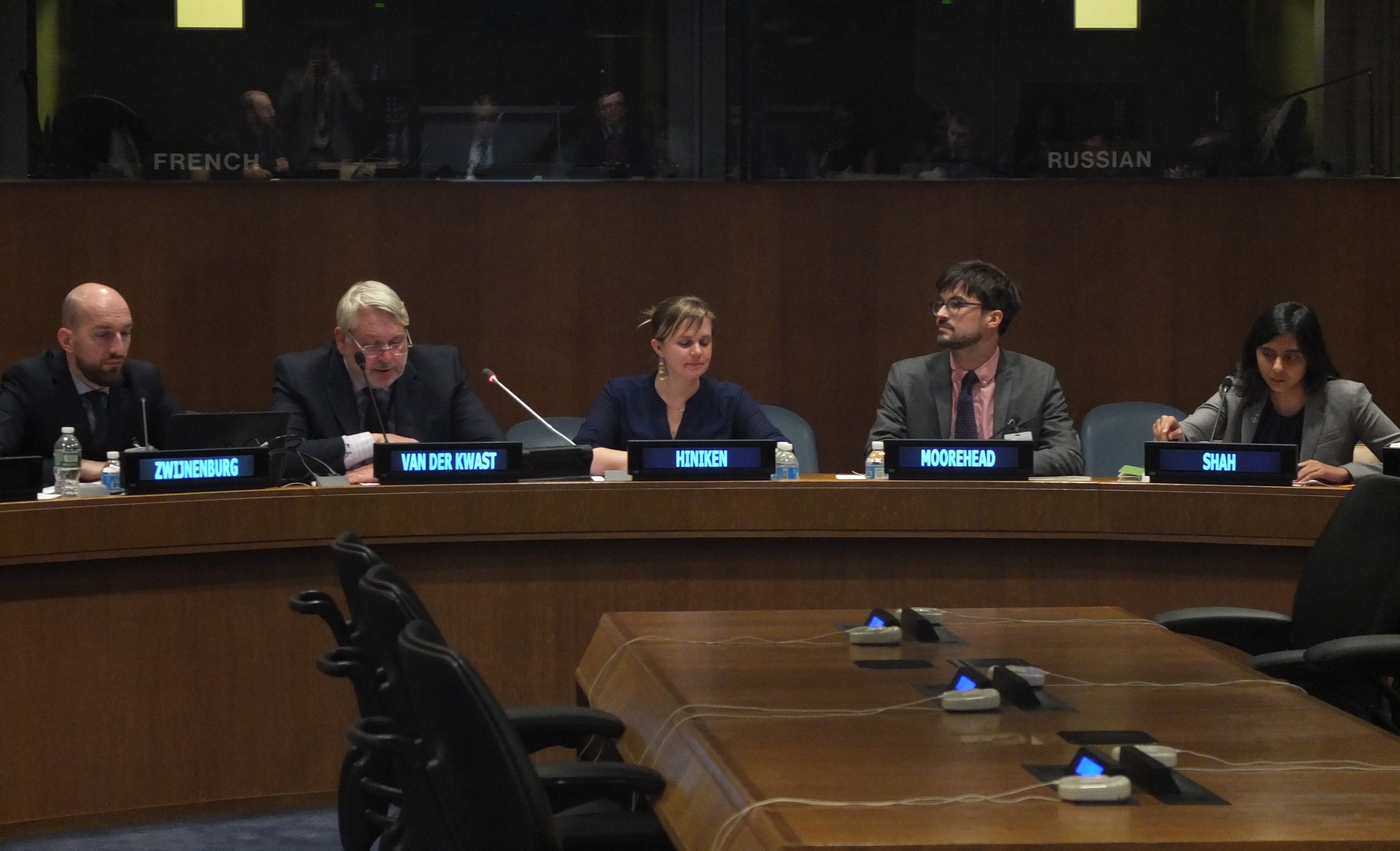 (From Left to Right) Mr. Wim Zwijnenburg, (PAX for Peace Policy Advisor, Security & Disarmament); Ambassador H.E. Mr Henk Cor van der Kwast, (Permanent Representative of the Netherlands to the Conference on Disarmament in Geneva and the Ambassador for Disarmament); Alexandra Hiniker, (PAX for Peace representative to the United Nations); Alex Moorehead, (Director, Project on Counterterrorism, Armed Conflict and Human Rights at Columbia Law School) and Naureen Shah, (Director of Amnesty International USA’s Security & Human Rights Programme).