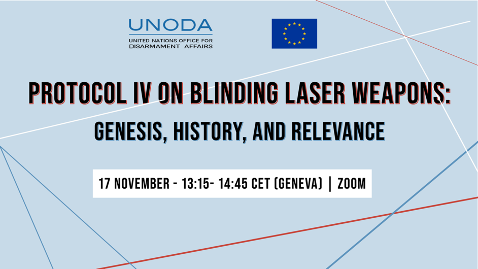 On 17 November 2022, UNODA Geneva hosted a webinar on the genesis, history and relevance of Protocol IV on Blinding Laser Weapons of the Convention on Prohibitions or Restrictions on the Use of Certain Conventional Weapons (CCW). The webinar was organized on the margins of the Meeting of High Contracting Parties to the CCW, as part of the EU Council decision (CFSP) 2021/1694 in support of the universalization, implementation and strengthening of the CCW.