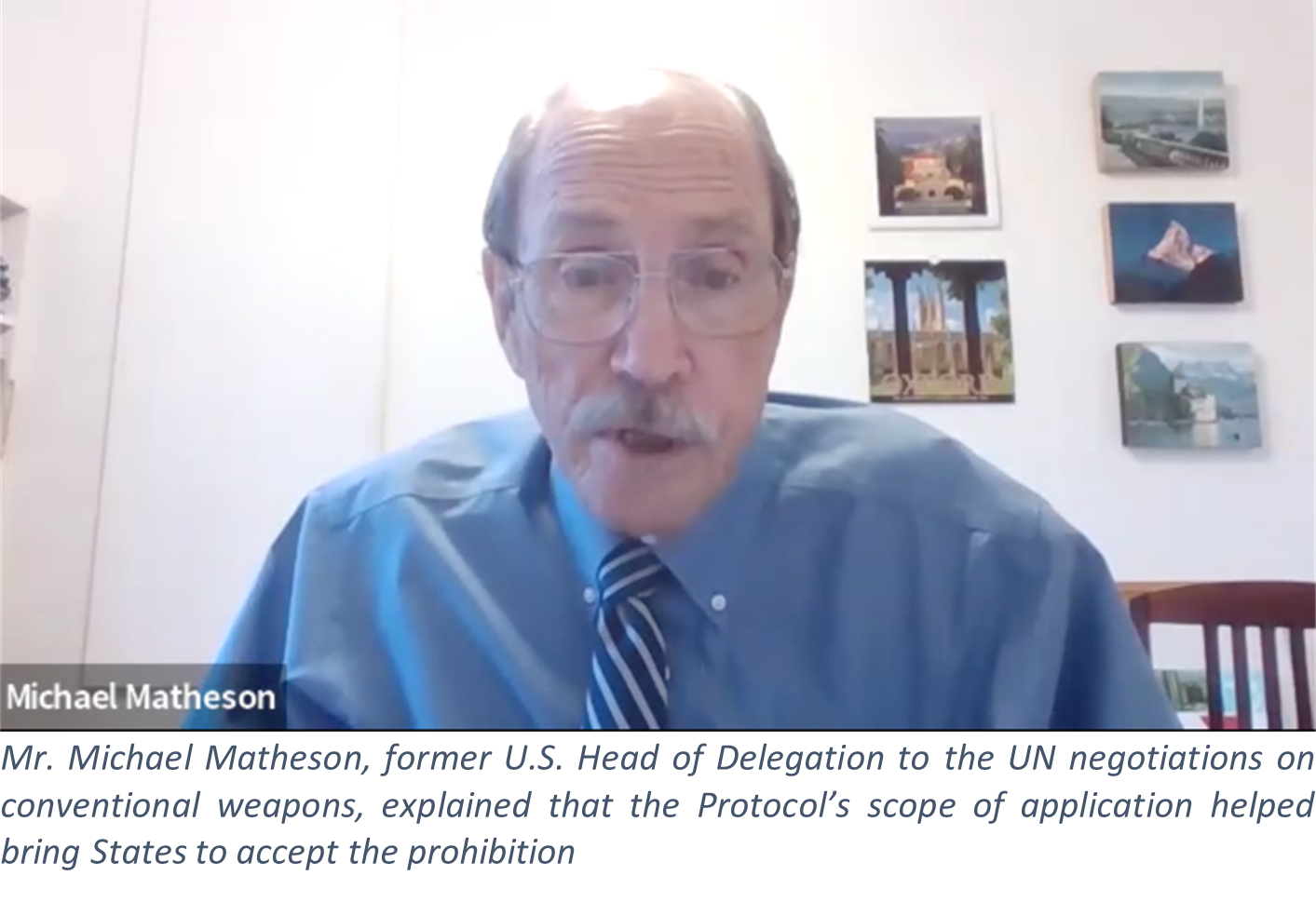 Mr. Michael Matheson, former U.S. Head of Delegation to the UN negotiations on conventional weapons, explained that the Protocol’s scope of application, limited to weapons causing irreversible (permanent) and serious blindness to unenhanced vision, helped convince some initially reluctant States to accept their prohibition.