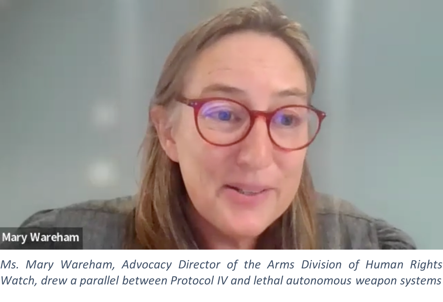 The final speaker, Ms. Mary Wareham, Advocacy Director of the Arms Division of Human Rights Watch,drew a parallel between Protocol IV and lethal autonomous weapon systems, with regards to the threat to the principles of humanity and dictates of public conscience, and the risk of widespread proliferation of such weapon systems to actors with little regard for international law. She further stated that, as with the negotiations leading up to the adoption of Protocol IV, States could agree on international regulations on the use of lethal autonomous weapon systems to clarify and strengthen existing law without limiting the development of artificial intelligence and technology for peaceful uses. Ms. Wareham acknowledged that the work conducted under the CCW thus far has provided a wealth of information and concrete proposals for regulating and/or prohibiting certain types of weapons. However, she expressed concern about the decision-making challenges to the CCW’s progress towards the regulation of certain weapon systems that may produce superfluous injury, unnecessary suffering, or indiscriminate effects, such as lethal autonomous weapons.