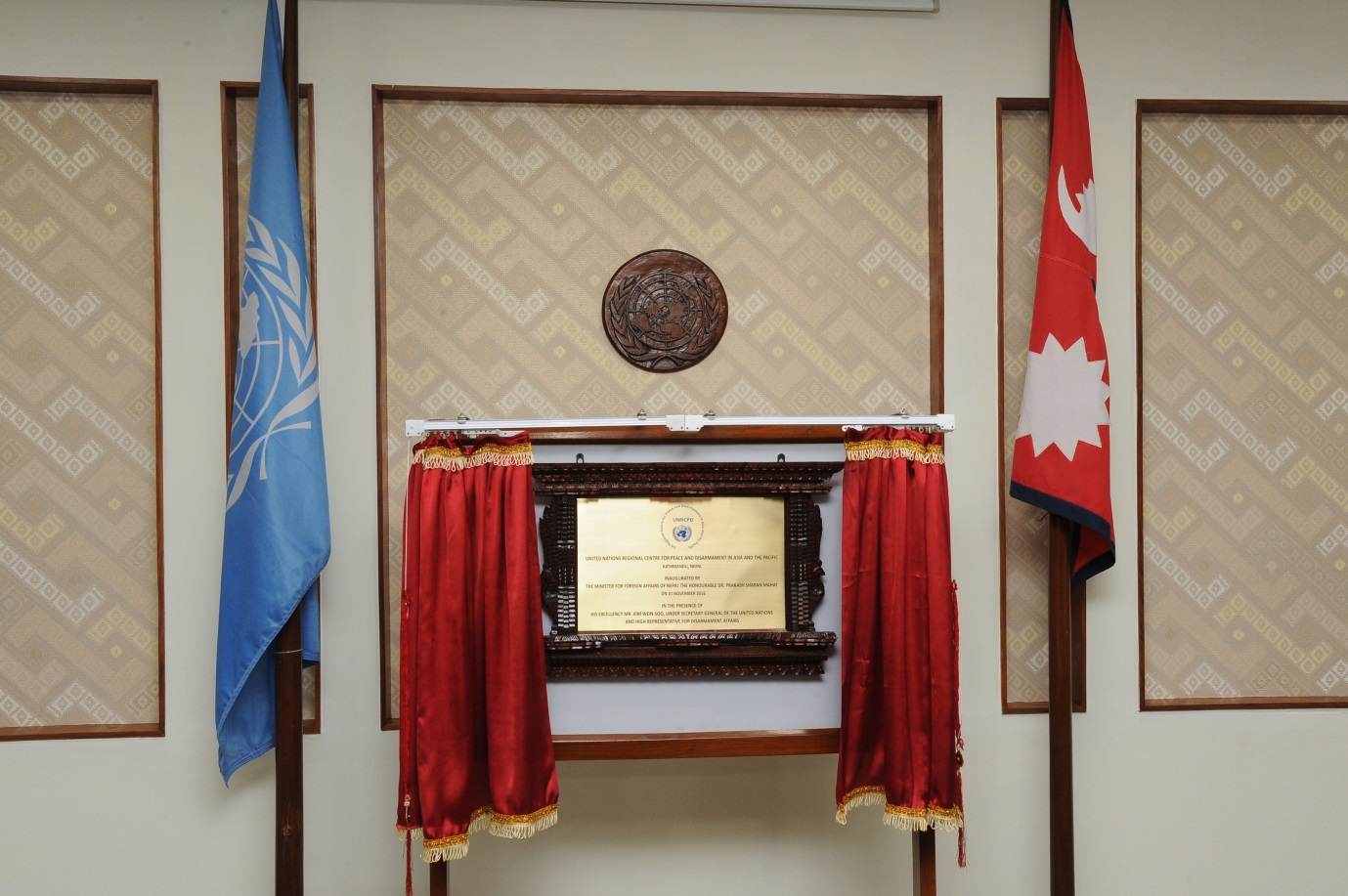 On 21 November, the Foreign Minister of Nepal, Dr. Prakash Sharan Mahat, and the Under-Secretary-General and High Representative for Disarmament Affairs, Mr. Kim Won-soo, unveiled a plaque commemorating the resumption of operations of the Regional Centre for Peace and Disarmament in Asia and the Pacific (UNRCPD) in its new premises in Kathmandu, following its temporary relocation after the 2015 devastating earthquakes in Nepal.
