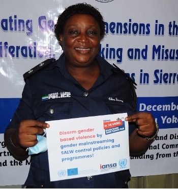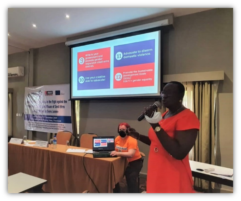 One day of the training was dedicated to civil society, including the Sierra Leone Action Network on Small Arms (SLANSA) and the Women’s Forum Sierra Leone, presenting their initiatives aimed at engaging women and youth in reducing armed violence. They also conducted an awareness raising activity to celebrate the 16 days campaign against Gender-based Violence – a global campaign to increase awareness, promote advocacy efforts and share knowledge and innovations to eliminate GBV. During this session, civil society representatives encouraged participants to consider “16 practical ways to get engaged in advocacy against gender-based violence” and encourage small arms control experts “to become allies for gender-responsive firearms laws” and to advocate to “disarm domestic violence”. Commemorating the International Day of Persons with Disabilities, which coincided with the campaign period, the training participants shared messages on social media to raise awareness about disability issues and to mobilize support for gender equality in arms control in Sierra Leone.