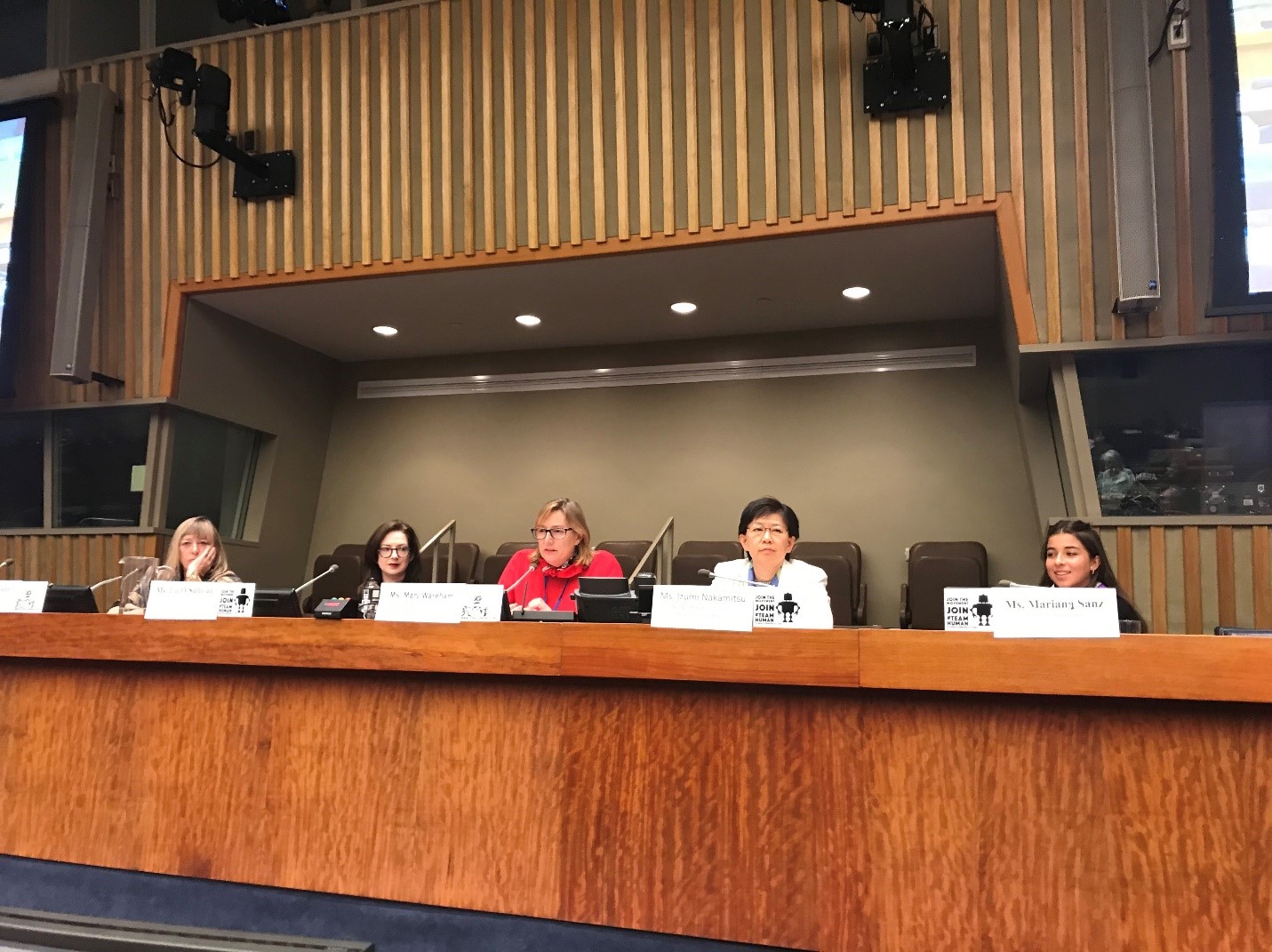 From left to right: Ms. Jody Williams, Ms. Liz O’Sullivan, Ms. Mary Wareham, High Representative for Disarmament Affairs Ms. Izumi Nakamitsu, Ms. Mariana Sanz