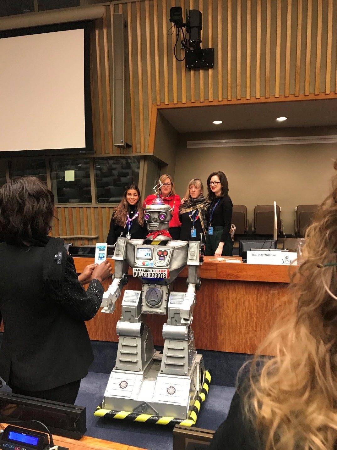 Ms. Mary Wareham, moderator and Coordinator of the Campaign to Stop Killer Robots, opened the panel discussion by informing the audience of a global coalition that consisted of 160 organizations working to ban killer robots. She stressed that the issue of lethal autonomous weapons systems (LAWS) is a very serious threat to humanity. Ms. Wareham then expressed her gratitude to the UN for allowing the Robot Campaigner into the UN.