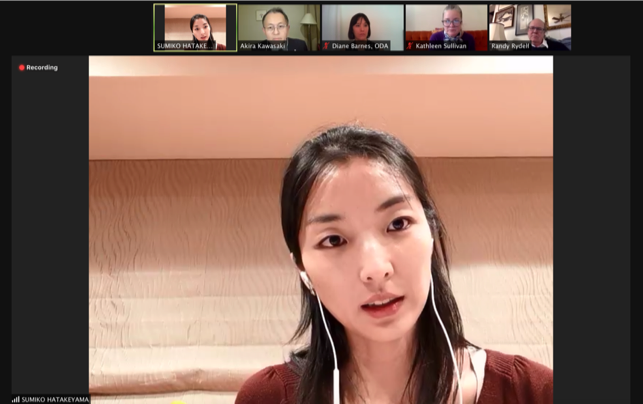 The event’s panelists—Ms. Sumiko Hatakeyama and Mr. Akira Kawasaki, co-authors of “Navigating Disarmament Education: The Peace Boat Model”, Dr. Kathleen Sullivan, the Director of Hibakusha Stories, and Dr. Randy Rydell, the Executive Advisor for Mayors for Peace—are joined by the event’s moderator, Ms. Diane Barnes.