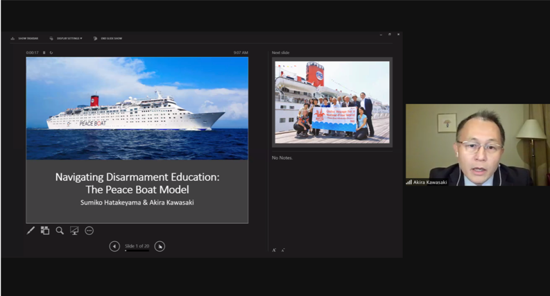 The co-authors of “Navigating Disarmament Education: The Peace Boat Model”, Ms. Sumiko Hatakeyama and Mr. Akira Kawasaki, reflected on Peace Boat’s foundation and its disarmament education approach, designed to help participants (a) understand the humanitarian consequences of weapons and develop a sense of empathy, (b) recognize the threats and dangers that exist in the world and (c) learn methods for taking action to facilitate disarmament. After their book explores each of these aims in dedicated chapters, it goes on to discuss the advantages of this education model as well as its various challenges, which now include repercussions of the COVID-19 pandemic.