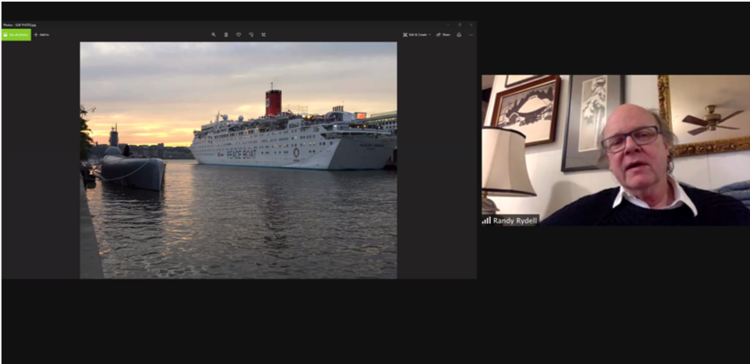 Dr. Randy Rydell, in discussing his personal experiences with Peace Boat, introduces a photo he took of the organization’s ship docked in New York harbour alongside the USS Growler, a submarine that once carried a nuclear-tipped cruise missile.
