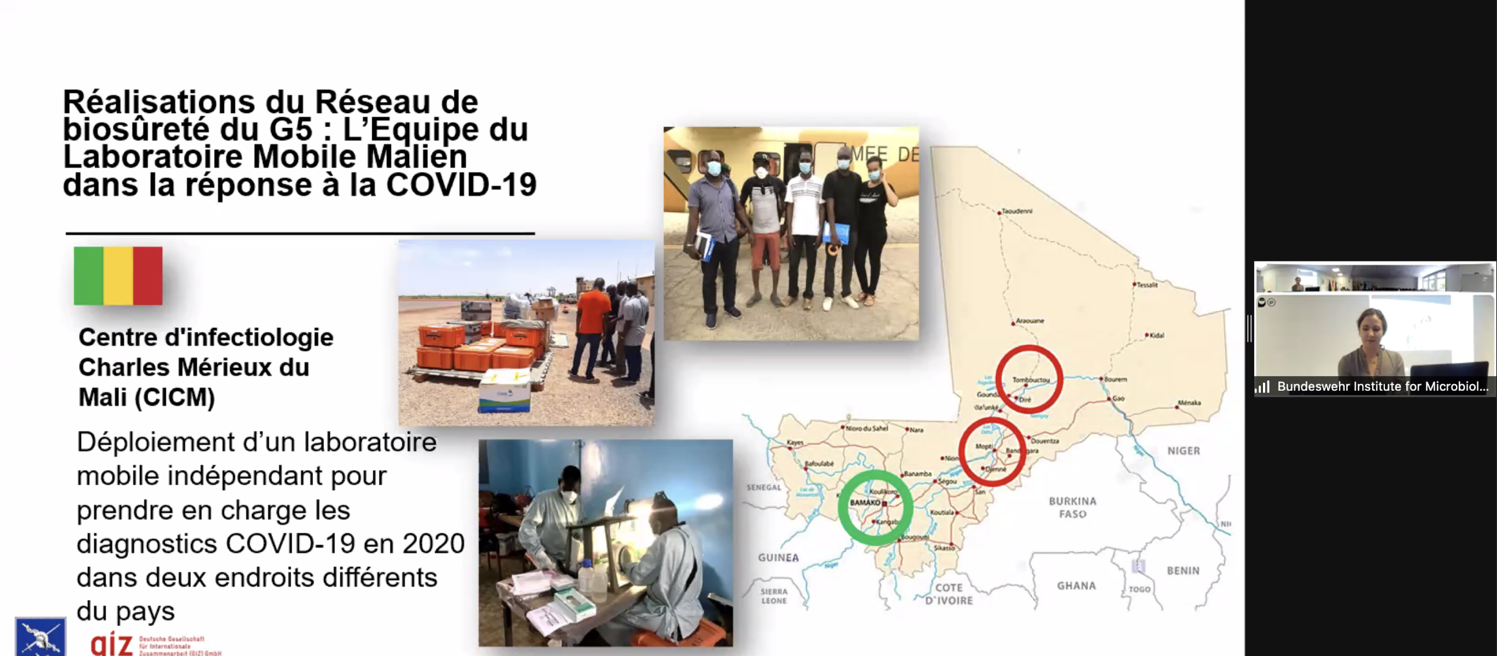 Dr. Olga Spaiser, project manager for the G5 Sahel biosecurity program at the GIZ moderated the subsequent sessions on the concrete situation in the G5 Sahel countries. Her colleague Ms. Annette Bremer, head of the German Biosecurity Program and the Enable and Enhance Initiative on Biosecurity at GIZ, began by outlining the main goals of the biosecurity project and the structure of the G5 Sahel Biosafety Network. Dr. Pina Knauff, project manager at the IMB and Prof. Mohamed Bollahi, Coordinator of the G5 Sahel Biosafety Network highlighted its key achievements to date. Some milestones, they said, include the delivery of a modular, rapidly deployable mobile laboratory to the G5 Sahel countries’ biosafety network; a joint field exercise with the mobile lab in 2019; the deployment of the mobile lab in Mali in 2020 to support COVID-19 diagnostics; and biosafety and biosecurity workshops. Additionally, future activities include training on risk and crisis communication and a joint field exercise with the participation of all G5 Sahel countries.