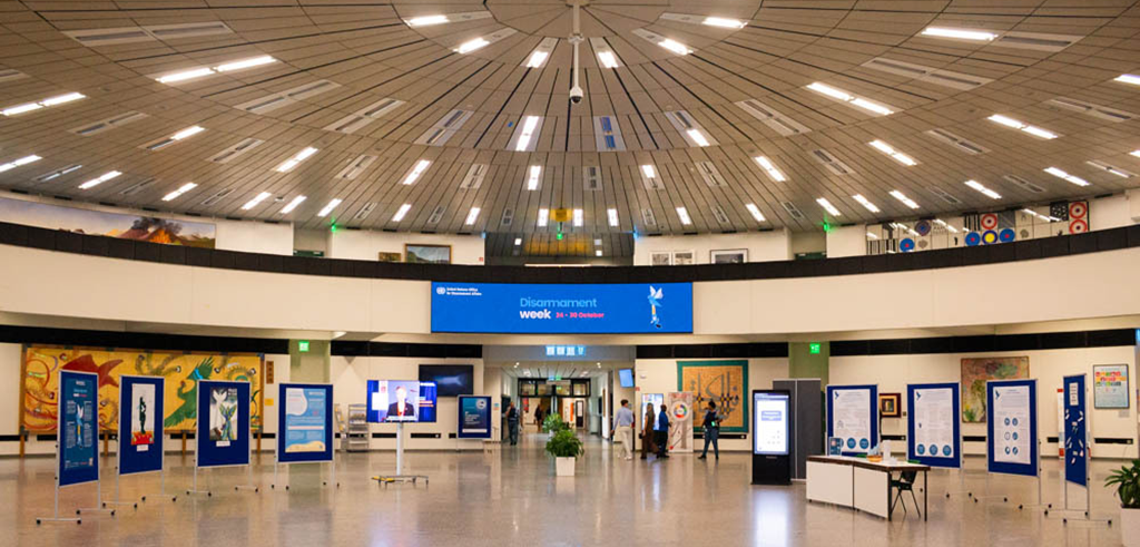 Disarmament Week seeks to promote awareness and better understanding of disarmament issues and their cross-cutting importance. To celebrate this remembrance week, central to the work of the United Nations Office for Disarmament Affairs (UNODA), the Vienna Office organised an interactive exhibition from 24 to 27 October 2023. It was housed in the Rotunda of the Vienna International Centre, which is home to various international organisations relevant to UNODA’s work, such as the International Atomic Energy Agency (IAEA), the Comprehensive Nuclear-Test-Ban Treaty Organisation (CTBTO), and the UN Office for Drugs and Crime (UNODC).
