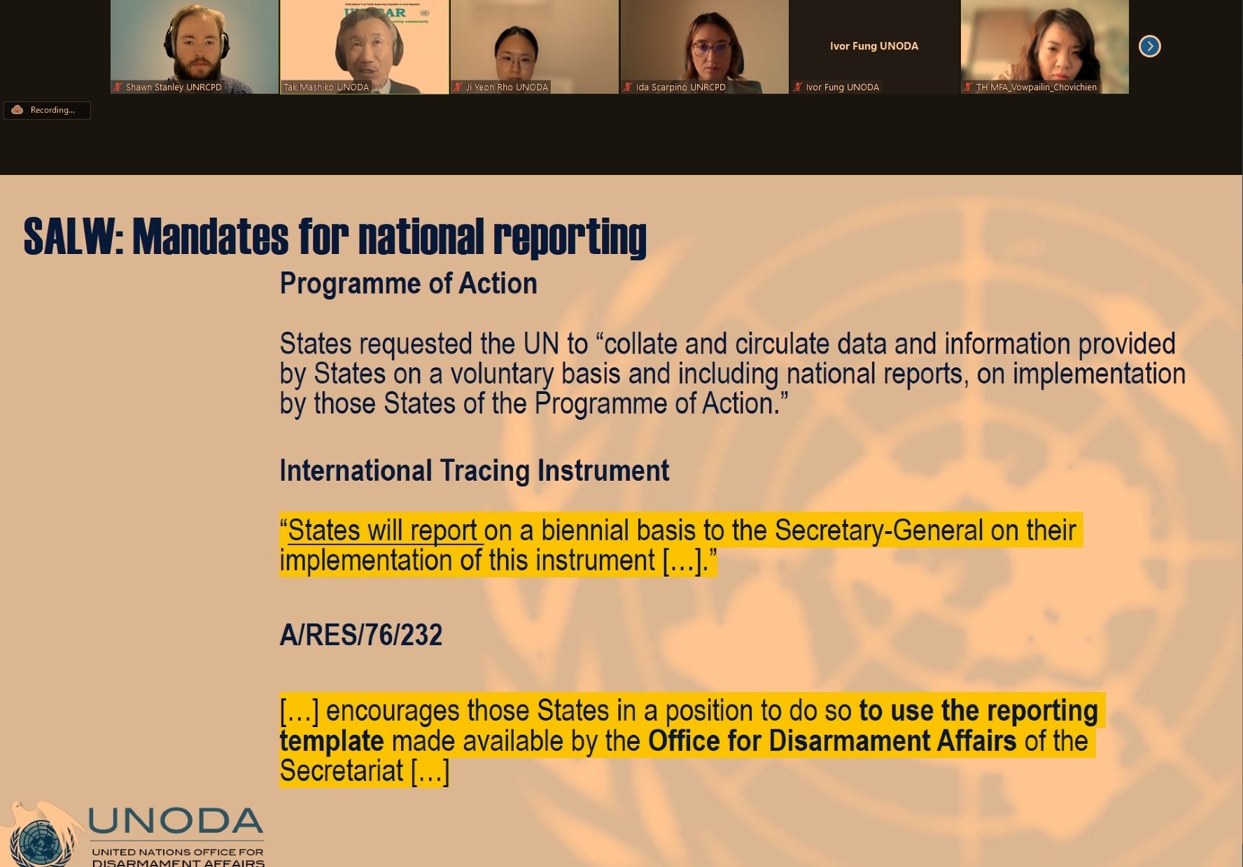 Government officials from nine countries in the Asia Pacific region joined UN experts for an online training on national reporting on the UN Programme of Action (UN PoA) in preparation for the Eighth Biennial Meeting of States (BMS8).