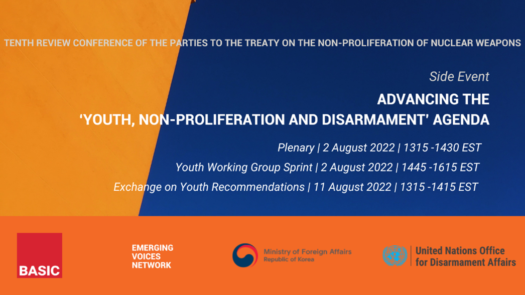 On 2 August 2022, young people across the world gathered online to share their perspectives on advancing the youth, non-proliferation, and disarmament agenda during two side-events to the Tenth Review Conference of the Parties to the Treaty on the Non-Proliferation of Nuclear Weapons (NPT). The two sessions form part of a wider series of side-event co-organized by the United Nations Office for Disarmament Affairs (UNODA), the Ministry of Foreign Affairs of the Republic of Korea, and BASIC’s Emerging Voices Network, to engage and empower young leaders on discussions taking place on nuclear disarmament.